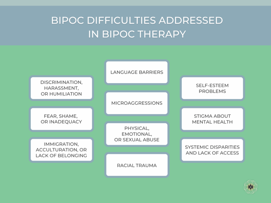 While Black, Indigenous, and People of Color are not a homogeneous group, BIPOC therapy can help you address difficulties experienced by BIPOC communities, including: